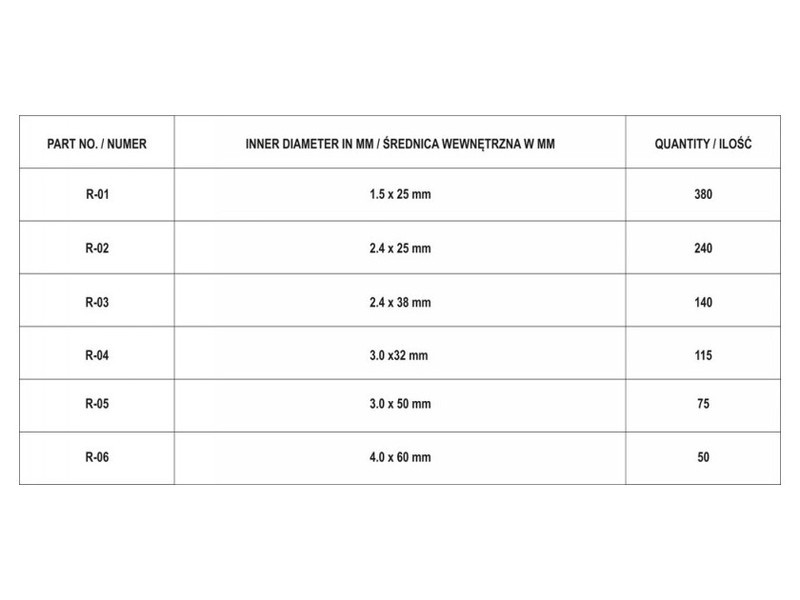 Set includesstraight pins x1000 (1.5x25 mm x380, 2.4x25 mm x240, 2.4x38 mm x140, 3x32 mm x115, 3x50 mm x75, 4x60 mm x50)