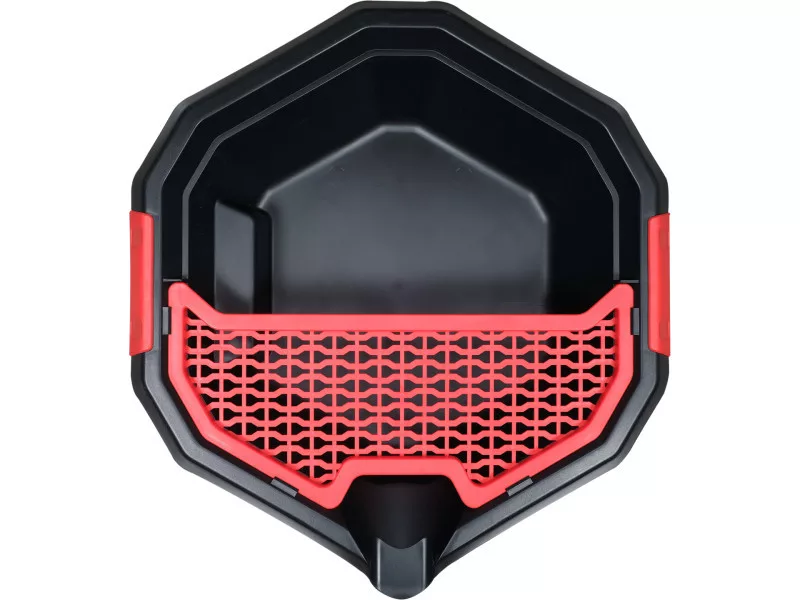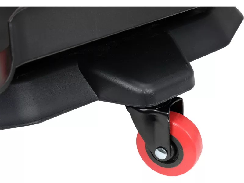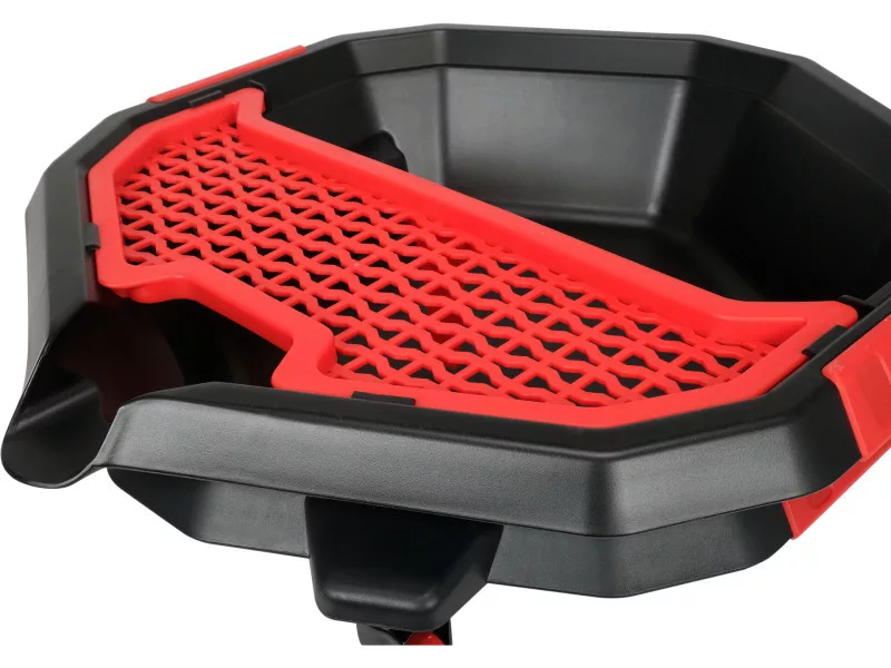 Oil change pan with additional tray for accessories and tools. Three castors allow quick adjustment of the bowl's position.