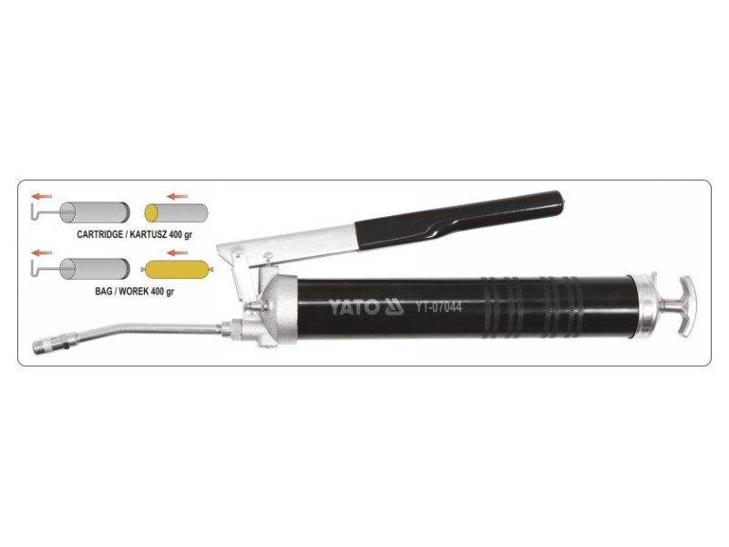 The hand grease gun is designed for high-pressure lubrication of mechanical components: shafts pins, joints bearings, calipers, etc. in cars, machinery agricultural and garden equipment.