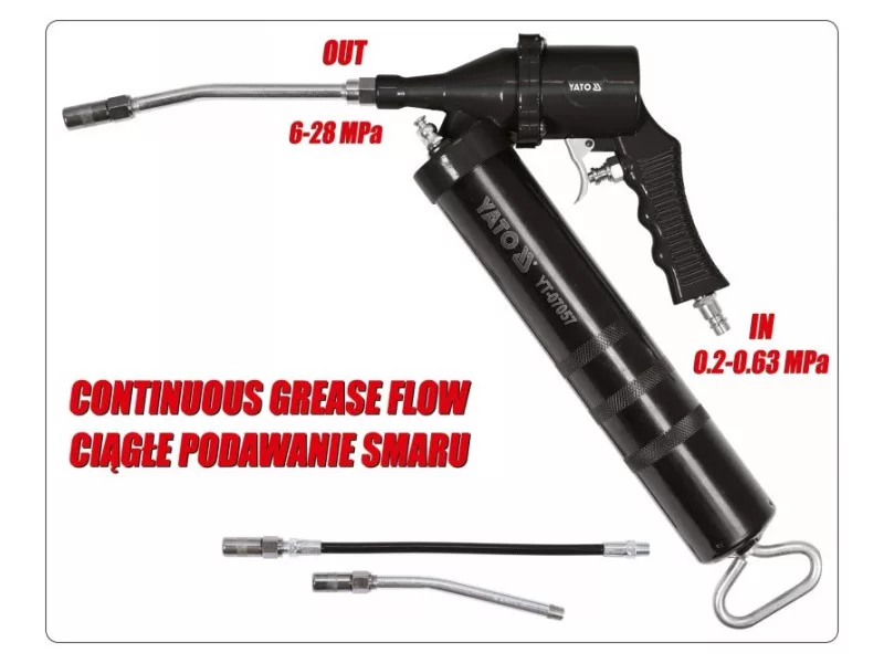 Performance lubricator designed for applying solid lubricantsós. By pressing the trigger, it enables the application of grease in continuous mode. Used in automotive workshops, agriculture and industry for maintenance of parts and equipment having calamity-type lubrication system.