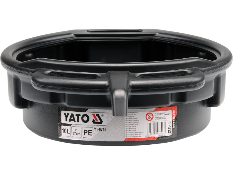 Bowl for pouring used oil or other operating fluids. Made of polypropylene, it has carrying handles and a contoured pouring area.Capacity: 10 liters.