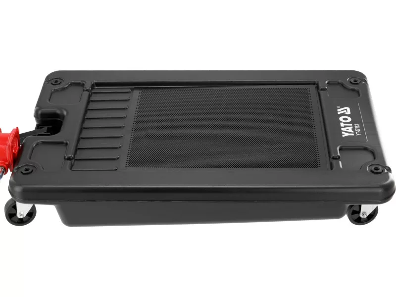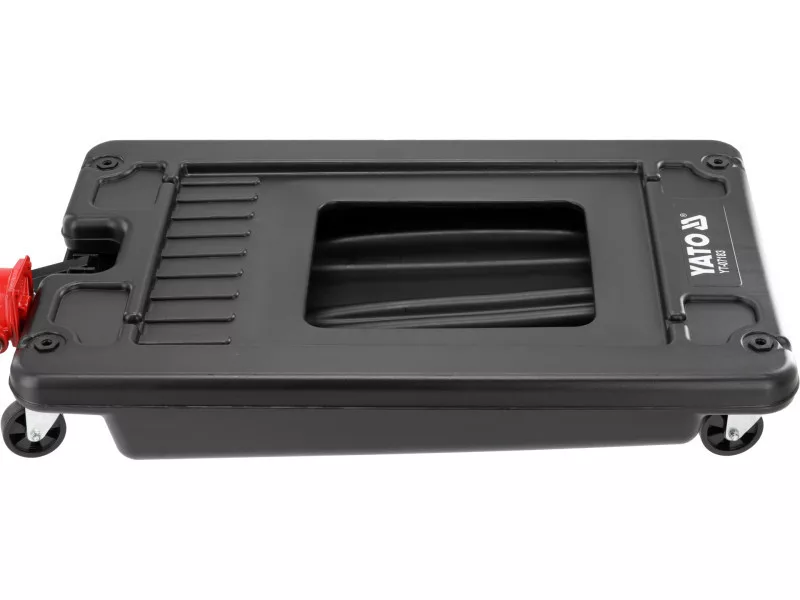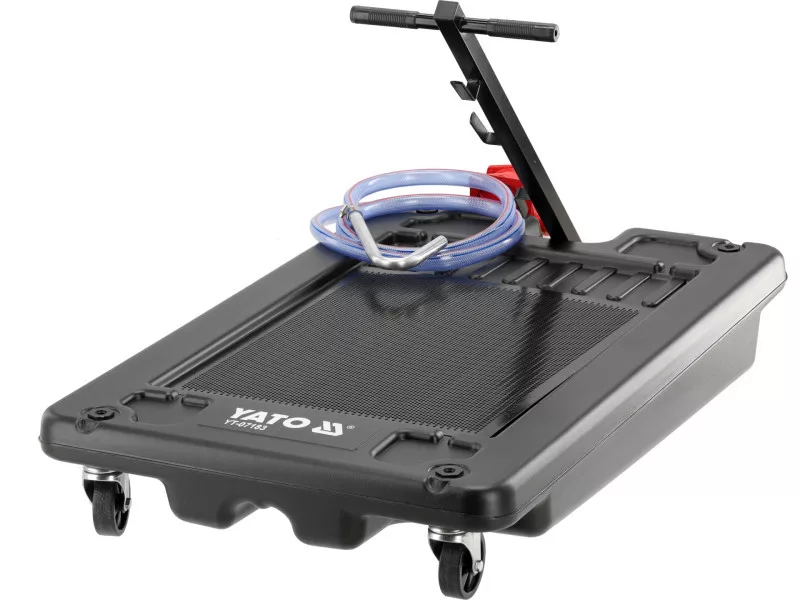 The oil drainer has a low-profile platform with a height of 185 mm from the ground, allowing for use in limited workspaces. Equipped with a manual suction pump that ensures efficient fluid removal. The device's mobility is ensured by four reinforced wheels with a diameter of 95 mm and a "T" type transport handle. Standard equipment includes a 2.4-meter evacuation hose.