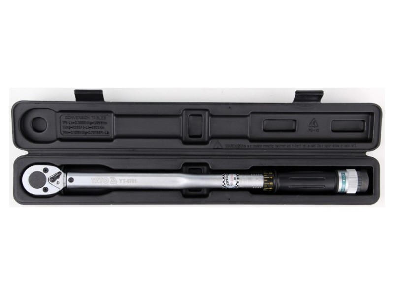 The key is made of chrome-vanadium steel, which ensures its durability and strength. It has a mechanical dynamometric stretch, which after reaching the desired tightening force jumps with one clove, making a characteristic sound. The scale of moments is placed in the key handle, its adjustment occurs through its rotation. After setting the desired moment, block the key with protection at the end of the handle. The key has a GS certificate. Comparative statement of moments in various units of length and force: 1 kg*cm = 13.887 OZ*in (ounce X inch) 1 kg*cm = 0.867 LB*in (Punish X inch) 1 kg*m = 9,80665 n*m ( Niuton x meter) 1 kg*m = 7,233 lb*ft (pound x foot) 1 ft*lb = 12 lb*in (pound x inch) 1 dm*n = 14.16 oz*in (ounce x inch) is used Mainly in automotive technique for precise fastening and wherever the manufacturer determined the required time of tightening the connector. - Choose the appropriate NM or In-LBS scale. Unlock the micrometer knob. - Place the micrometer knob so that "0" on the scale of the knob covers with a vertical line on the key's shoulder. - rotate the micrometer knob according to the direction of the clockwise movement until the requested torque is set. - The desired torque is set when the scale on the micrometer knob will cover with the vertical line on the key's shoulder. - Then block the micrometer knob and set the appropriate direction of rotation of the ratchet, after that the key is ready for use. - Appropriate attachment should be applied to the key. When tightening, reaching the set moment is signaled by clicking the key. If you hear or feel the click, stop tightening. - dynamometric key - factory calibration certificate (individual for each key, marked with the serial number of the key) - user manual - warranty card - suitcase