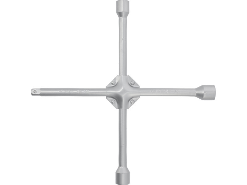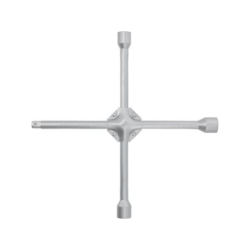 Cross key for car wheels, useful especially during tire changes or tightening and loosening screws. Made of damage-resistant carbon steel, maintaining long lifespan.