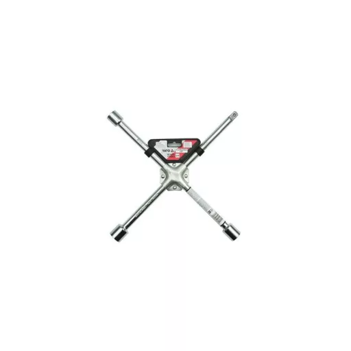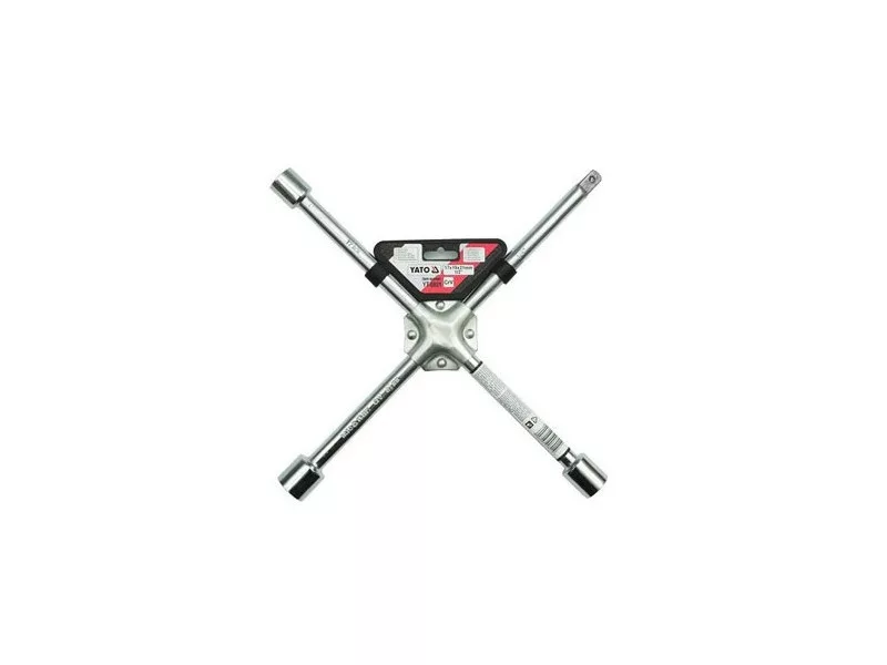 Teutonic Key for Car wheels. Made of high-quality chromium-vanadium steel. It has 4 arms with attachments adapted to all hexagonal, metric types of screws and caps used in passenger cars and light vans. The cross was additionally strengthened with double, riveted steel sheet. It increases safety and comfort of use. The key especially recommended for tire services and as passenger car equipment. - 17 mm - 19 mm - 21 mm - 1/2 "(12.7 mm)