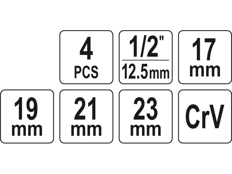 • chrome-plated sockets of 17 mm, 19 mm, 21 mm, 23 mm