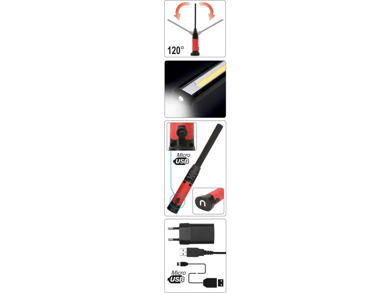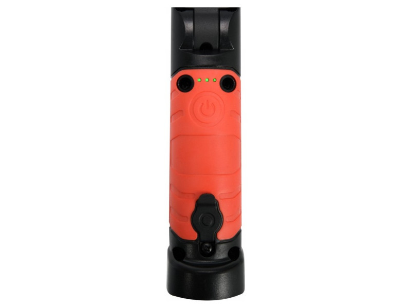 Functional 5W workshop lamp with a 3W flashlight placed on top. The light output of 600 lumens and 3 light modes guarantee efficient and comfortable work. The Magnet on the bottom allows the lamp to be attached to metal parts. The long, thin and adjustable top of the lamp will make it easy to enlighten hard-to-reach places.