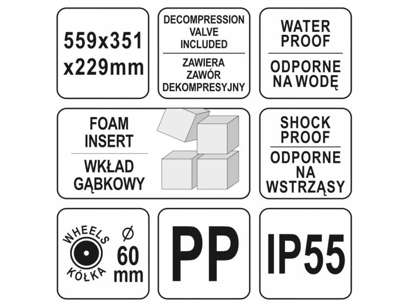 Hermetic, waterproof and dustproof case resistant to many chemicalsós and corrosion. Made of flexible polypropylene according to IP55 resistance class.It features an effective sealing system, enriched with a decompression valve for equalizing pressures during air transport.
