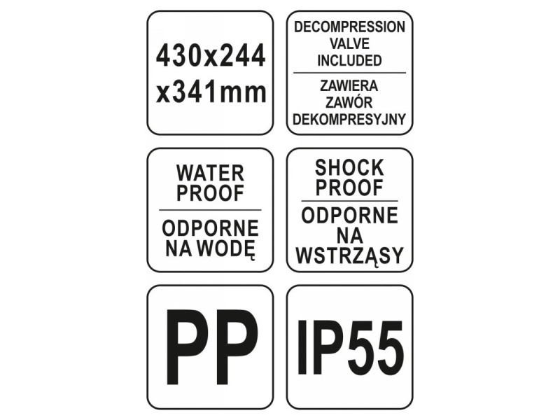 Hermetic, waterproof and dustproof case resistant to many chemicalsós and corrosion. Made of flexible polypropylene according to IP55 resistance class.It features an effective sealing system, enriched with a decompression valve for equalizing pressures during air transport.