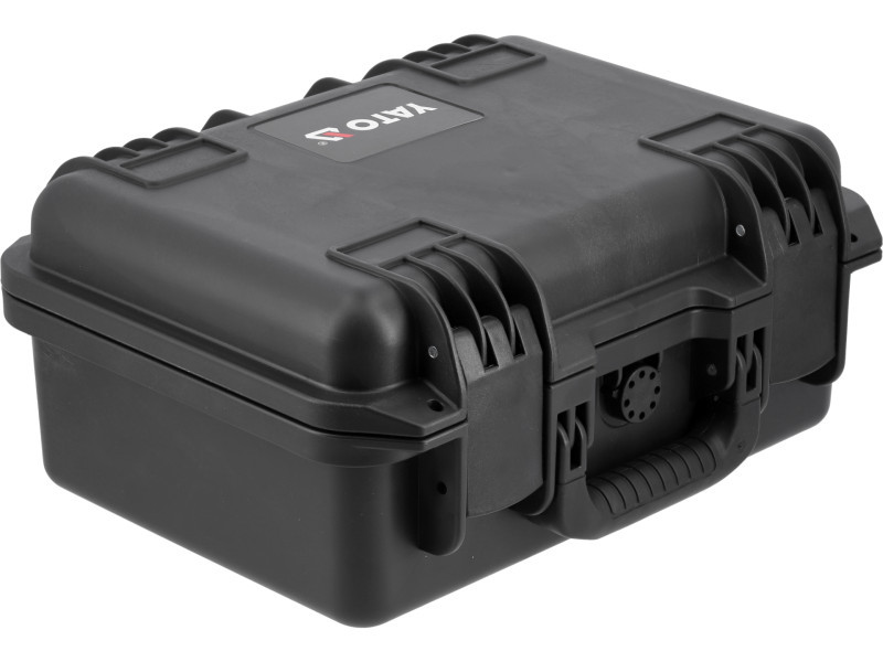 The case is airtight, waterproof and dustproof, resistant to many chemicals and corrosion. Made of flexible polypropylene in accordance with resistance class IP55. It features an effective sealing system, enhanced by a decompression valve for pressure equalisation during air transport. Adapted for padlock closure. The interior of the case is filled with pre-cut sponge, prepared for modelling recesses for specific products, e.g. tools, photographic equipment or measuring equipment.