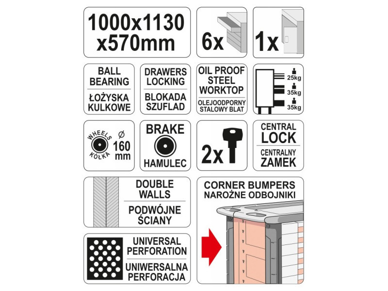 • 4 large (160 mm) rubber wheels provide excellent steering, and an effective brake makes the cabinet can be safely placed in the desired location
