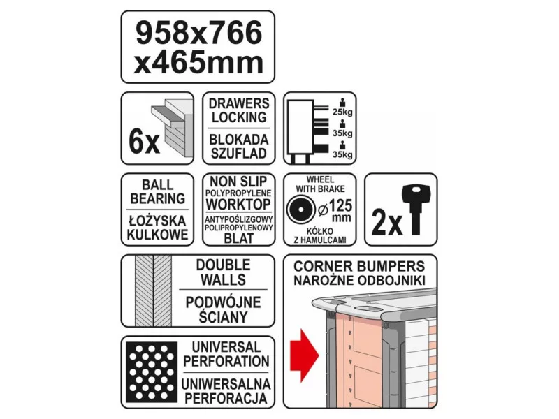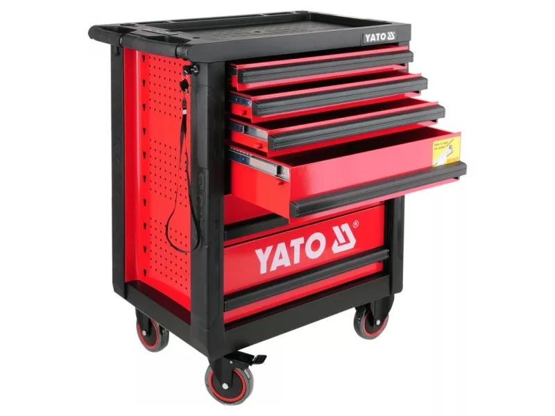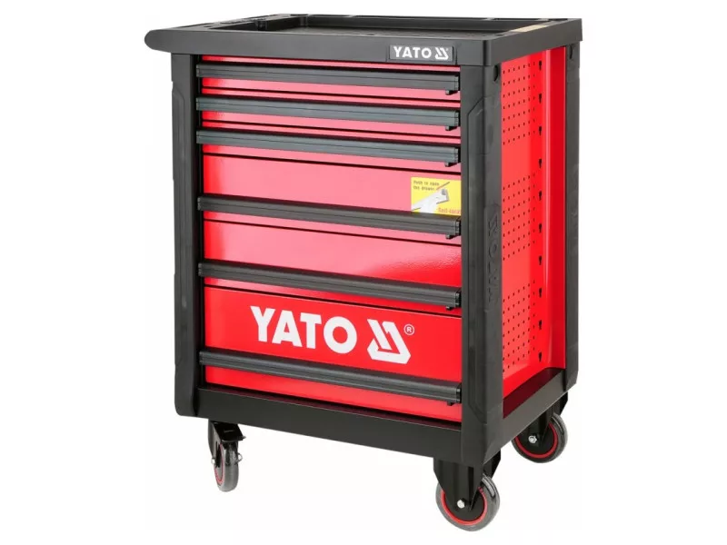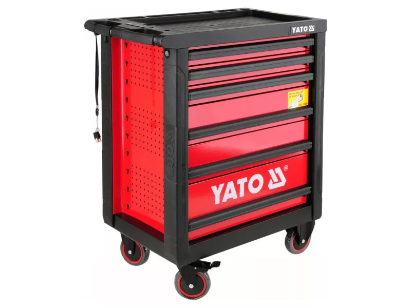 Yato service cabinet. It has 6 drawers on ball guides. Profiles made of double steel sheet. Central locking and individual closure for each drawer. The cabinet has corners that protect against accidental damage, e.g. car body. The top is made of polypropylene, withstands a load of 450 kg. Necessary in car workshops and vehicle service stations.
