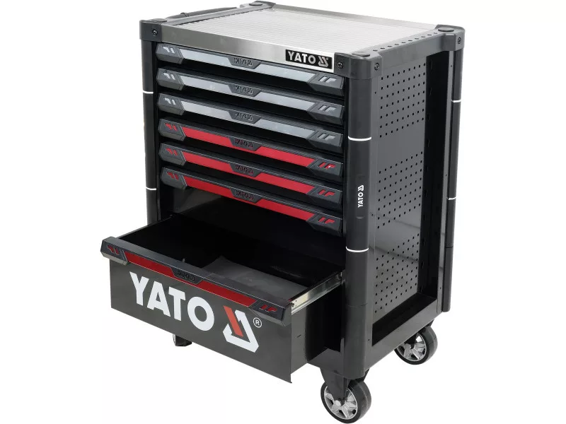 The new YT-09032 service cabinet is a unique design with a mechanism that locks the possibility of opening more than one drawer at the same time. All drawers work smoothly thanks to the use of special guides with bearings. The whole unit is locked with a central lock.