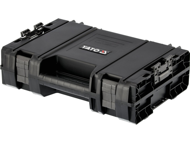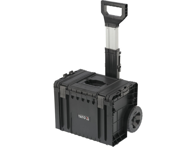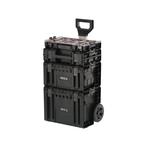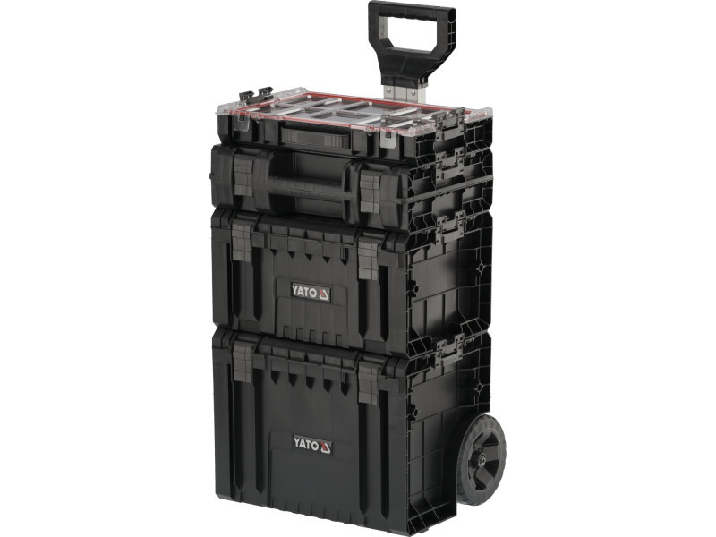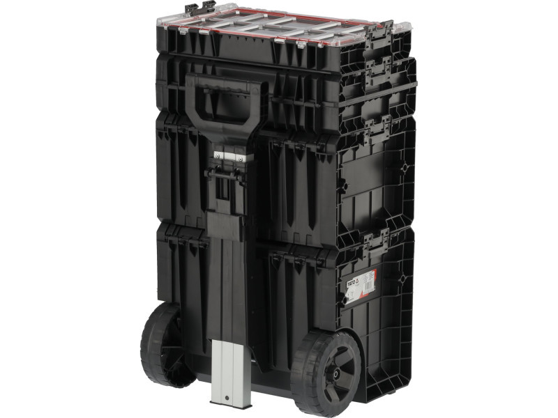 The whole is a 4 element mobile set on wheels with telescopic handle, it has large rubber-covered wheels mounted on a metal axle. In addition, the safety of transported tools is also taken care of by solid fasteners and side connectors made of strong polyamide. Flexible seals installed in the lids ensure splash-proof , which protects the contents from splashing and dust.