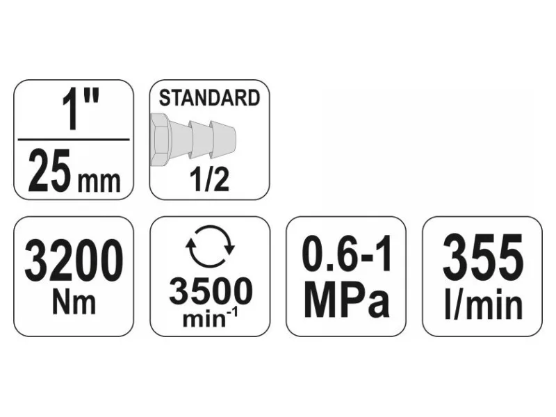 The wrench requires an air flow of 355 l/min and a pressure in the range of 0.6-1 MPa.