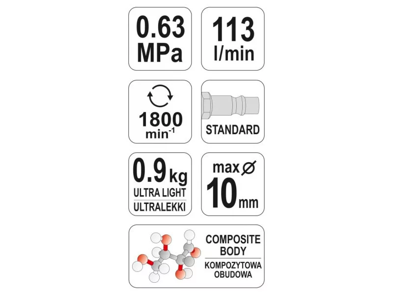 | Set includes | pneumatic drill, air inlet connector, key for mounting the drill |