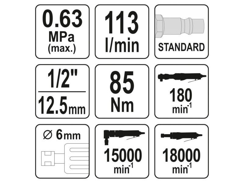 Rotations180 (ratchet), 18000 (straight grinder), 15000 (angle grinder) min⁻¹