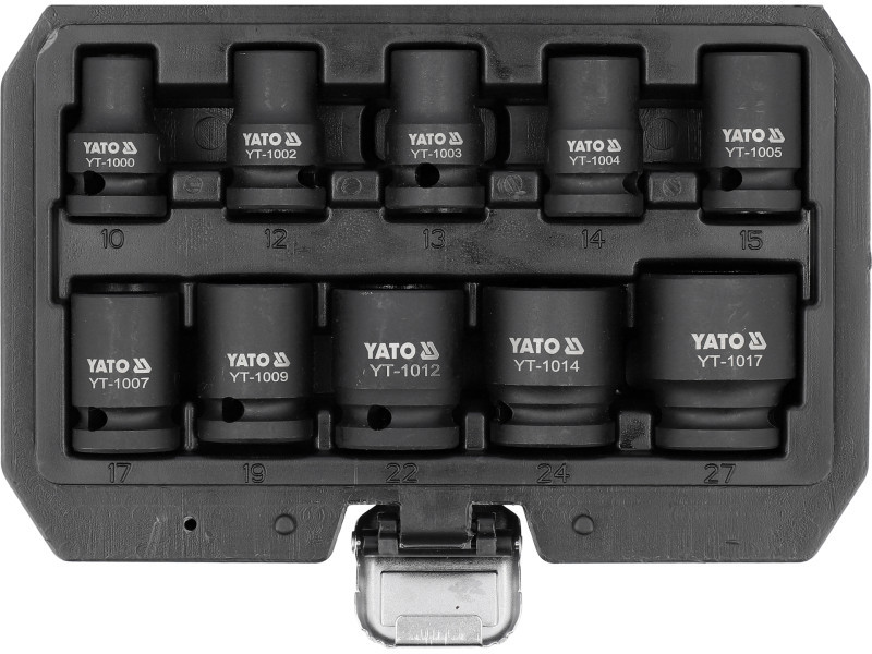 • includes 10 hex sockets in sizes: 10, 12, 13, 14, 15, 17, 19, 22, 24, 27 mm
