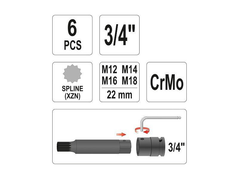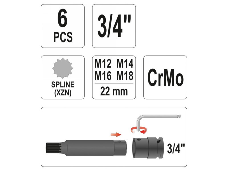 YATO Maschinenbit-Steckschlüsselsatz 6-teilig Spline 3/4" M12-M18 CrMo YATO Maschinenbit-Steckschlüsselsatz 6-teilig Spline 3/4" M12-M18 CrMo YATO Maschinenbit-Steckschlüsselsatz 6-teilig Spline 3/4" M12-M18 CrMo