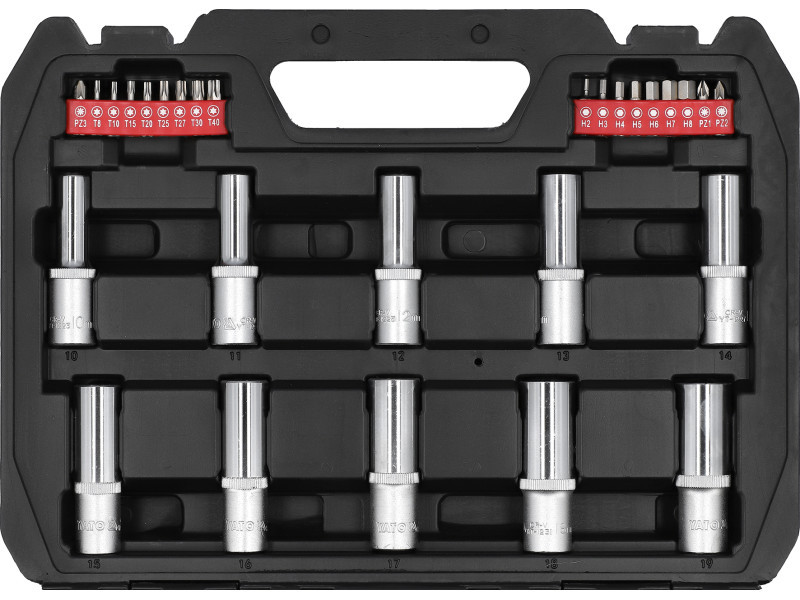 Professional tool set developed to meet the needs of specialized automotive and mechanical services. The socket wrenches, as well as the socket drive, were made of durable tool steel. The sockets were made using the drop-forging method, and before the hardening process, they were calibrated using precision gauges and inspection equipment. The sockets with the AS-Drive system, which increases the maximum torque by 25% while fully protecting the nut edges. The sockets have a two-tone surface finish. The set also includes bits made of hard S2 steel.