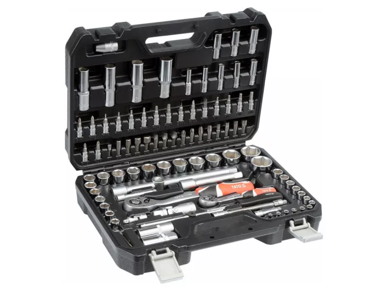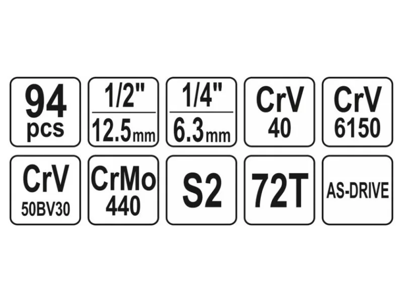 A professional tool set, developed for the needs of specialized car and mechanical services. The socket keys and the drives of the attachment were made of durable CRV 50BV3 chrome-vanadium steel. The attachments equipped with the AS-Drive system, increasing the maximum moment by 25%, with full protection of the cutter of the caps, the attachment with a two-tone surface finish. The attachments were made using the matrix method, and before the hardening process they were calibrated with precise fittings and control devices. The set enables work that requires very high loads and precision, allows you to perform many service activities related to unscrewing and screwing threaded connections of various nominal sizes.
