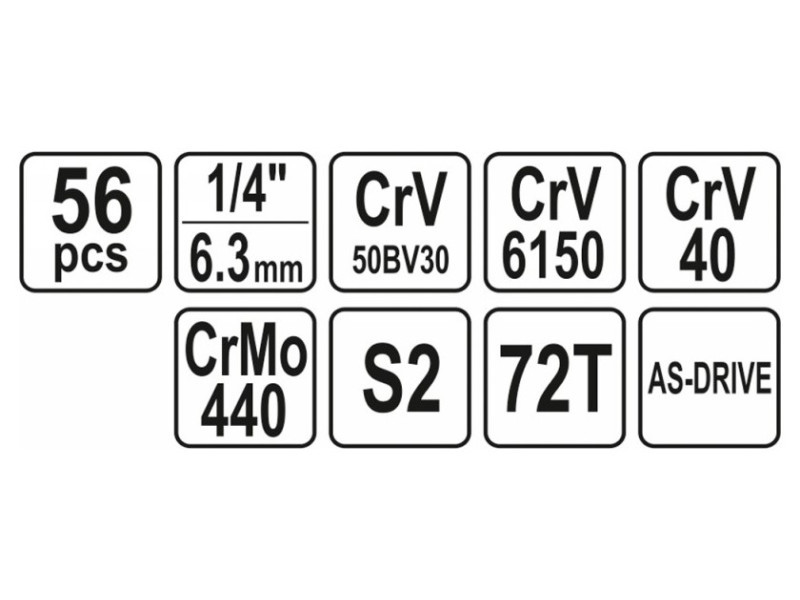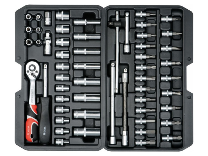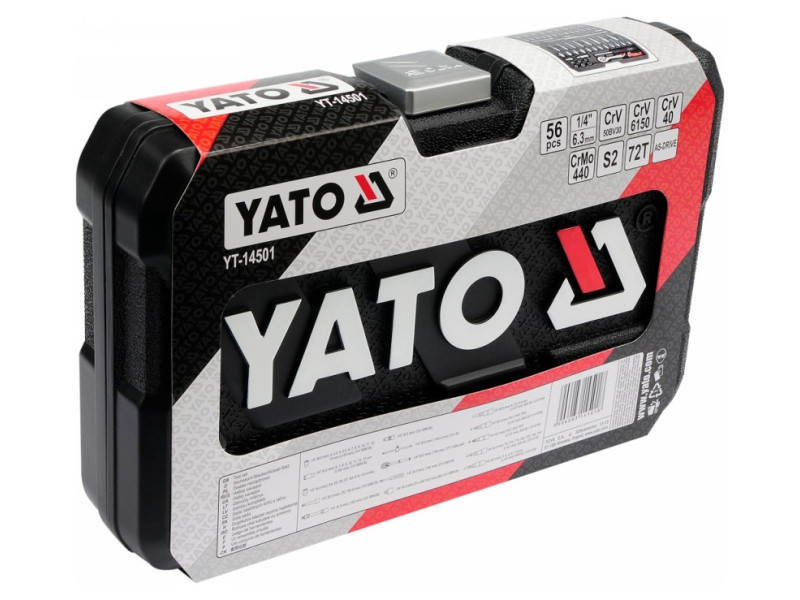 A professional tool set, which was developed for the needs of specialized car and mechanical services. The socket wrenches and the drive of the attachment were made of durable, tool-vanadium steel CRV 50BV3. The attachments were made using the matrix method, and before the hardening process they were calibrated with precise fittings and control devices. The set enables work that requires very high loads and precision, allows you to perform many service activities related to unscrewing and screwing threaded connections of various nominal sizes. Rattle 72 teeth (working stroke 5 degrees). 1/4 "attachments: 4; 4.5; 5; 5.5; 6; 7; 8; 9; 10; 11; 12, 13 mm, l = 25 mm, 6; 7; 8; 9; 10; 11; 12; 13 mm, L = 50 mm Torx attachment: E4; E5; E6; E7; E8; E10 extensions1/4 ", 76mm, 152.4mm reduction 1/4" "(f) x 3/8" "(m) extension flexible 1/4 ", 150 mm ratchet 1/4": 150 mm; 72T 1/4 "screwdriver, 150 mm Sliding knob 1/4": 150 mm Cardana1/4 "Adapter for the ends of the Philips Cross screwdriver: PH1; PH2; PH3; PH3 Cross screwdrivers Nonincles: PZ1; PZ2; PZ2; PZ3; PZ3 Flat screwdriver : 34; 5.5; 6.5 mm Six -legged screwdriver: 3; 4; 5; 6; 7; 8 mm Allen keys HEX: 1.5; 2; 2.5 mm Torx screwdriver: T8; T10; T15; T20; T25; T30; T40 Suitcase