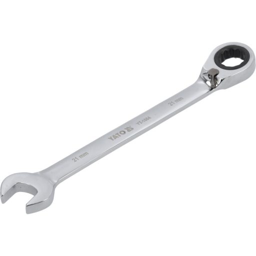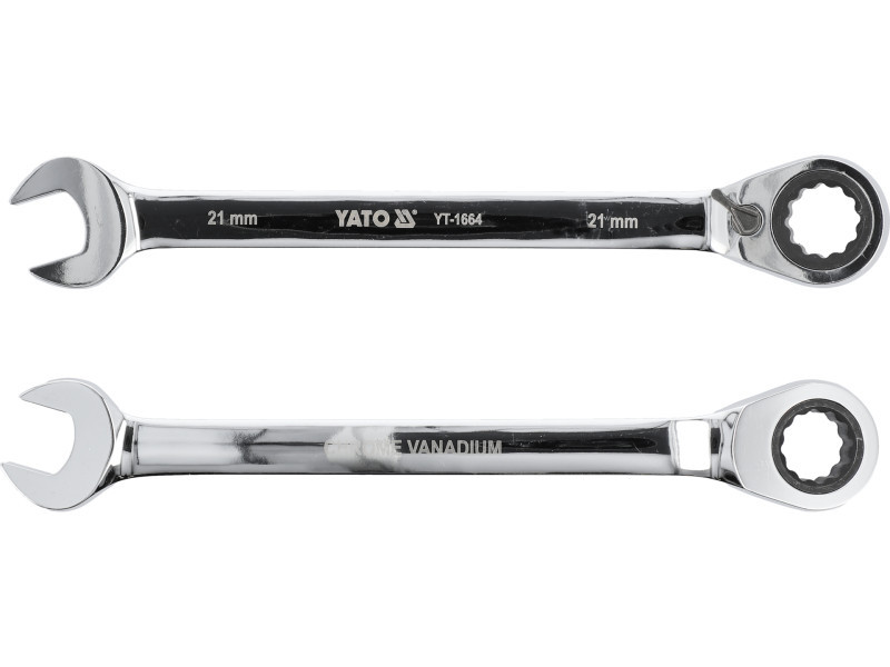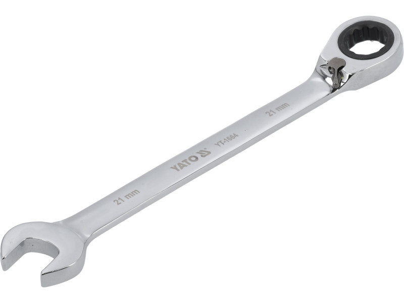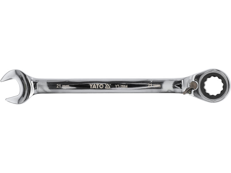 Flat-end wrench with ratchet and direction switch. Designed for automotive workshops and service shops.