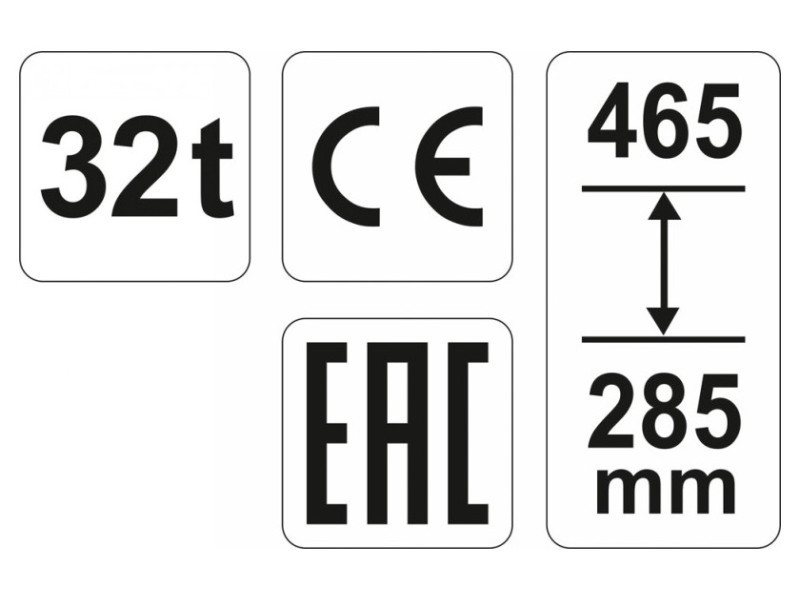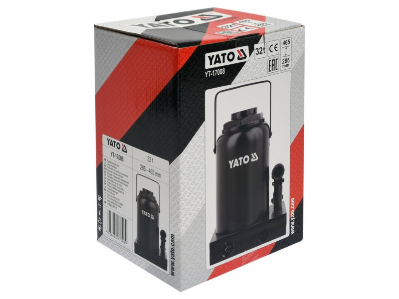 Professional YATO brand hydraulic post lift, featuring a system of valves that precisely dose the oil flow. The lifting capacity of the jack is 32 tons, and the lifting range is from 285 mm to 465 mm. It is characterized by its small size and weight, which is important for moving and storage. Indispensable in auto repair shops and vehicle service stations.