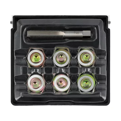 Kit for the simple repair of oil pan drain plug threads, gearboxes, etc. Fits most threads commonly used on cars and light trucks.