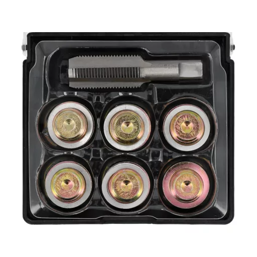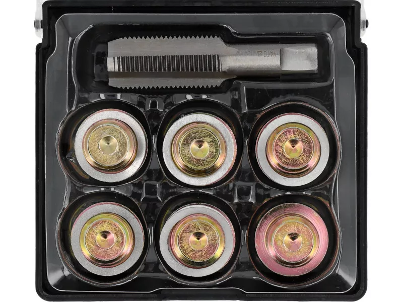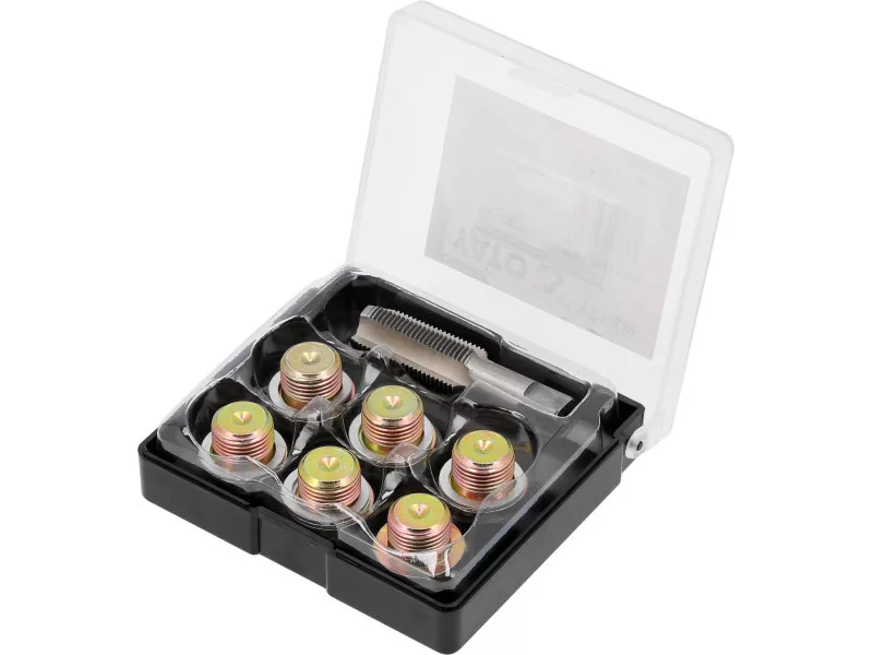 Kit for the simple repair of oil pan drain plug threads, gearboxes, etc. Fits most threads commonly used on cars and light trucks.
