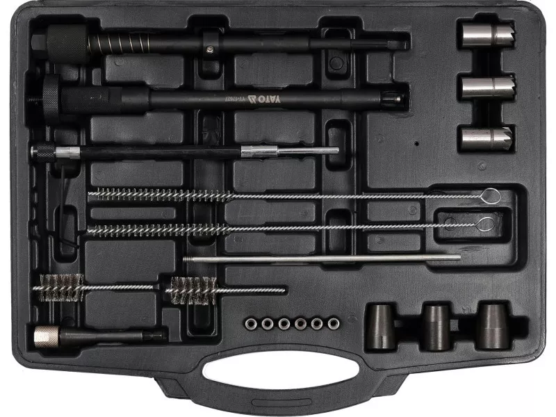 Set includescutter x3, centering sleeve x3, tool for dismantling injector washers, cutter knob, manual cleaning brush x2, mechanical cleaning brush x2,