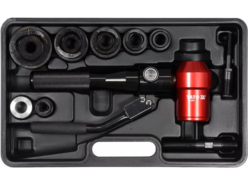 Set for cutting round holes in sheets in the diameter range from 22-60 mm. The head of the hydraulic actuator can be rotated 360 degrees. It is intended for cutting holes in the production of resolution cabinets for mounting cans or switches. When cutting the holes, the surface of the sheet is not deformation and damage. The set is easy to transport- packed in a durable suitcase. Contains matrices and stamps cutting holes with diameters 22 mm/0.9 ", 27.5 mm/1.1", 34 mm/1.3 ", 43 mm/1.7", 49 mm/2.0 ", 60 mm/2.4 ". The emphasis on the material during cutting is about 6 tons. Suitable for cutting holes in steel sheets, stainless sheets and colored metals. The thickness of the cut material depending on its type up to 3 mm. The set includes 6 pairs of dies/stamp and matrix/fi 22, 27.5, 34, 43, 49, 60 mm, 2 puffs for fastening 7/16x3/4 inches and 3/4x3/4 inches, manual actuator and 1 sealing set for quick cutting in sheet metal, large, precise holes with diameters from 22-60 mm in accordance with the instruction on the user manual. Transfer the appropriate fastener connected to the actuator through the drilled material, mount the stamp on it on one side on the other. . Manual cylinder with rotating head, cutting stamps 22 mm/0.9 ", 27.5 mm/1.1", 34 mm/1.3 ", 43 mm/1.7", 49 mm/2.0 " , 60 mm/2.4 matrices suitable for stamps- 22 mm/0.9 ", 27.5 mm/1.1", 34 mm/1.3 ", 43 mm/1.7", 49 mm/2 , 0 ", 60 mm/2.4 Plays for fastening 7/16x3/4 inches and 3/4x3/4"., Sealing set packed in a suitcase.