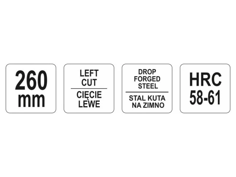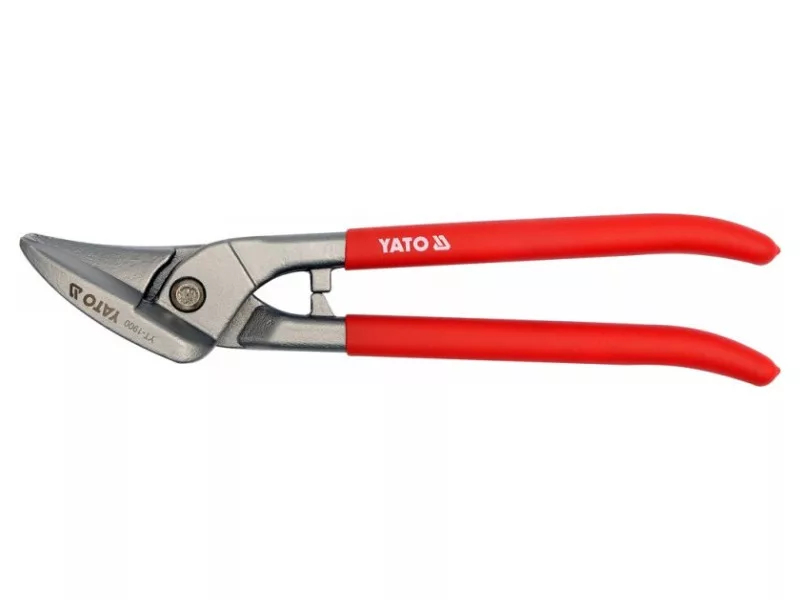 Professional roofing shears for cutting sheet metal, forged made of high-carbon steel, inductively tempered jaws to 58-61HRC hardness, surface finished with sandblasting. Handles covered with covers with hard, slippery vinyl.
