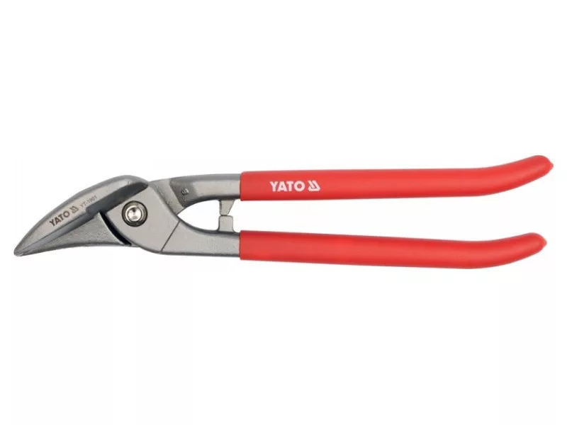 Professional roofing shears for cutting sheet metal, forged made of high-carbon steel, inductively tempered jaws to 58-61HRC hardness, surface finished with sandblasting. Handles covered with covers with hard, slippery vinyl.