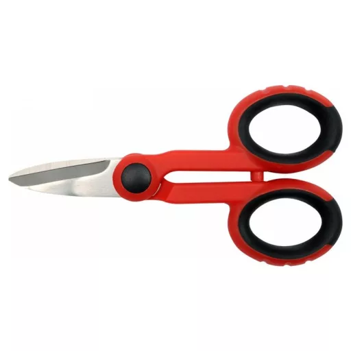 Scissors for electricians. Blades intended for cutting thin wires, insulation tapes of heat shrink tubes, etc. materials. Made of stainless steel with a symbol 3CR13SS. The working part is hardened to 52-56 HRC. Most of the scissors covered with a layer of insulating plastic. Handles additionally covered with TPR inserts. Total length 140 mm. For auxiliary work for electricians and electricians.