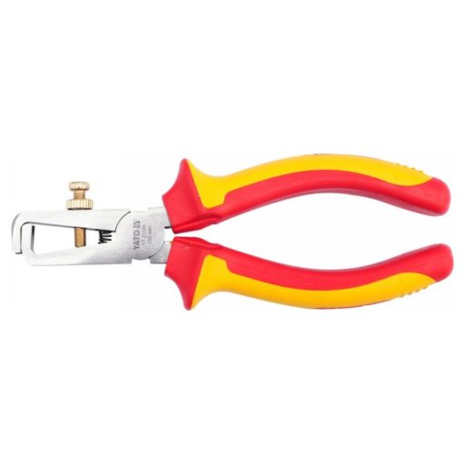 Cable wire stripping pliers YT-21160 with VDE insulation, made of high-grade CrV steel. V-shaped blade design that combined with the adjusting screw and opening spring do an excellent job in quick and precise stripping