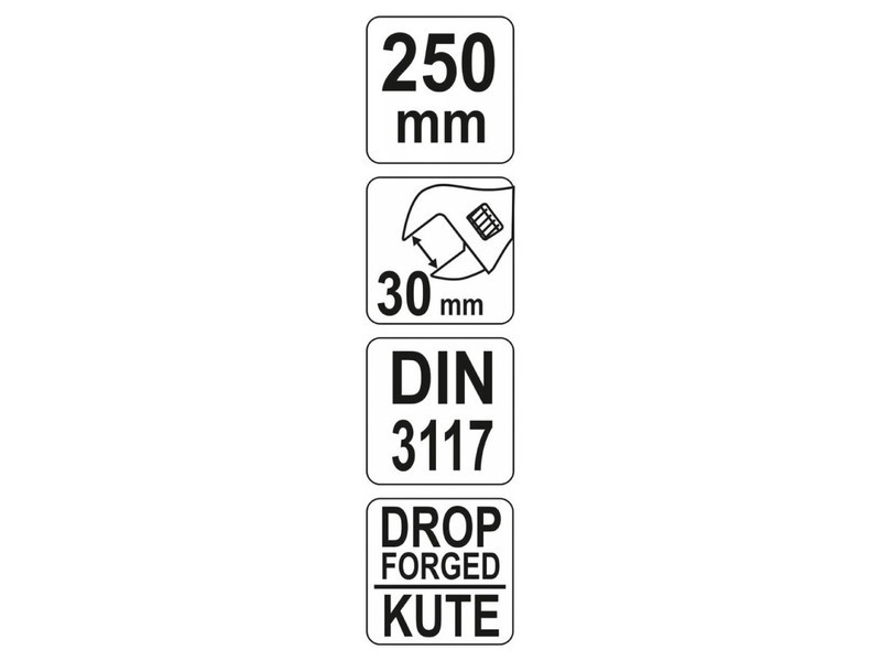 250 mm adjustable wrench made of forged chrome vanadium steel.