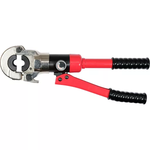 Handheld hydraulic press for crimping fittings on PEX-AL-PEX, PERT-AL-PERT pipes with a set of 8 dies. It is equipped with a hydraulic actuator that allows you to precisely and tightly crimp fittings with a pressing force of 10T. The quick die change system allows easy replacement of dies.