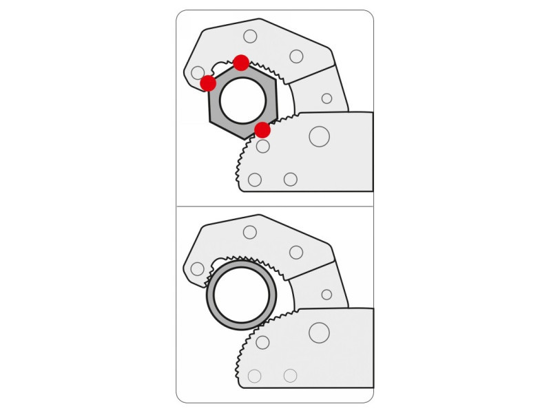 The upper jaw, with a special hook shape, together with the contoured lower jaw provide three-point contact with the unscrewed component. This makes it possible to work with bothpipes and all kinds of bolts, such as nuts and valves.