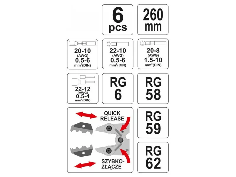 The pliers YT-2245 for crimping the most popular typesóof connectorsówith a blackened surface that protectsóagainst corrosion and two-component plastic handle caps. The precision jaw design facilitates the initial placement of the connector, while the longer-than-standard handles and the ratcheting mechanism clamp it precisely and firmly without using a lot of force.