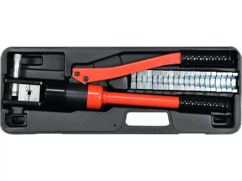 Hand press with a hydraulic cylinder. Designed for effective tightening of the tips on electric wires or for tightening of ropes. Thanks to the hydraulic actuator, clamping large tips does not require effort. Characteristic features of the YATO brand - Matrix blocking resistance bile - divided tightening matrix - piston - rotary cylinder head - actual valve of the actuator - moving the actuator arm - handle cover range. = 470mm Pressure: 18-20t Size of clamping jaws (MM2): 16; 25; 35; 50; 70; 95; 120; 150; 185; 240; 300