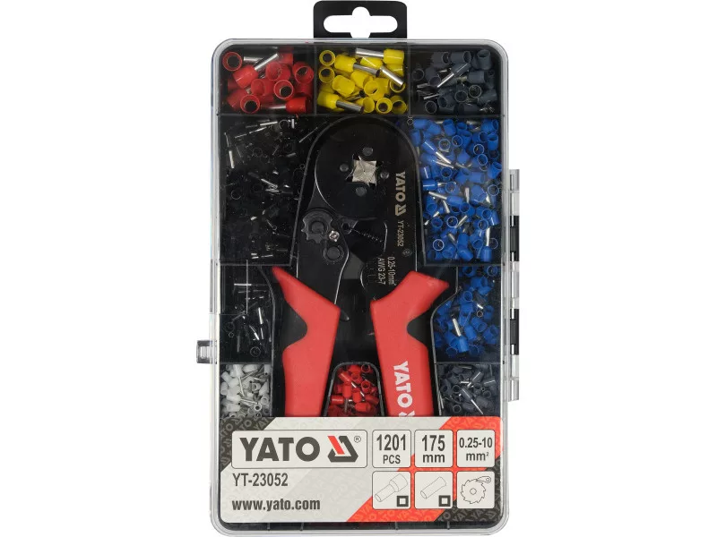 Pincers for crimping sleeve connectors on wires from 0.25 to 10 mm2 and 1200 pieces of sleeve type connectors. The pliers have a ratchet mechanism and are made of carbon steel. The blackened surface protects against corrosion. The four-piece sleeve clamp is made of tough 65Mn spring steel hardened to 50 HRC. The two-component handle caps are made of plastic. The harder PP component firmly adheres to the body, while the TPR outer part is pleasant to the touch and has non-slip properties.