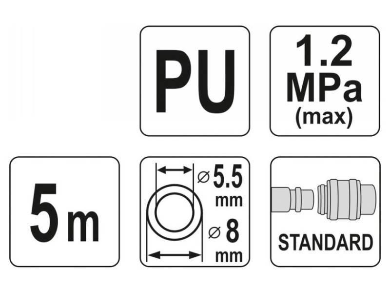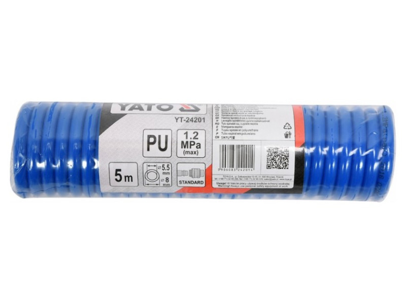 Professional spiral pneumatic hose terminated with quick disconnects. The 5.5x8 mm hose with a length of 5 meters is made of resistant polyurethane. The hose is resistant to low and high temperatures, so it can also be used outside the workshop.