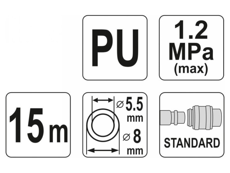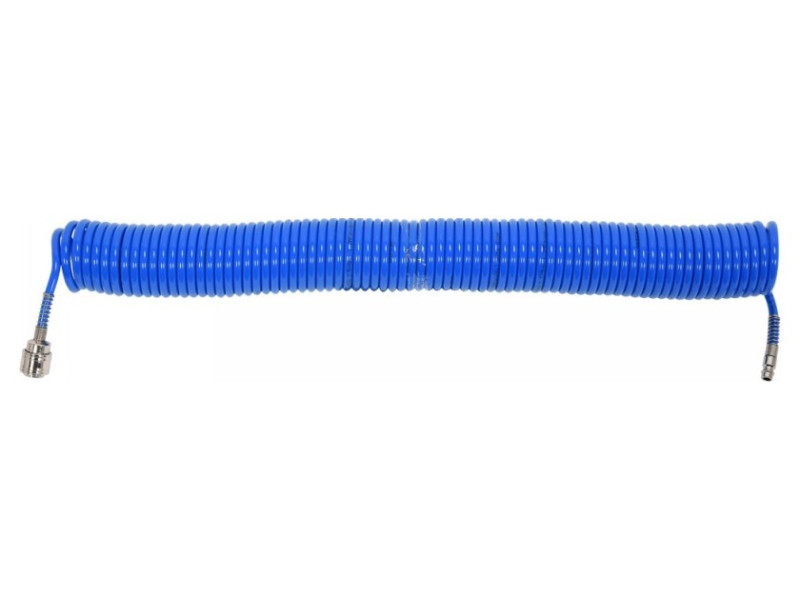 Professional spiral pneumatic hose terminated with quick disconnects. The hose is 5.5x8 mm with a length of 15 meters made of resistant polyurethane. The hose is resistant to low and high temperatures, so it can also be used outside the workshop.