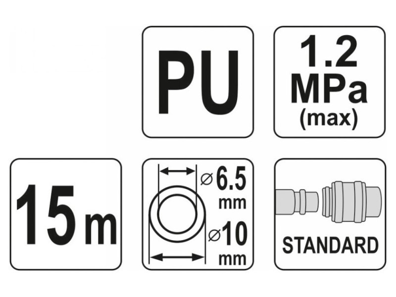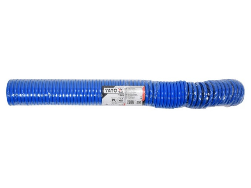 Professional spiral pneumatic hose terminated with quick disconnects. The 6.5x10 mm hose with a length of 15 meters is made of resistant polyurethane. The hose is resistant to low and high temperatures, so it can also be used outside the workshop. The fine coil design saves space, and the factory-installed quick couplings make it an indispensable tool in any workshop or manufacturing plant.