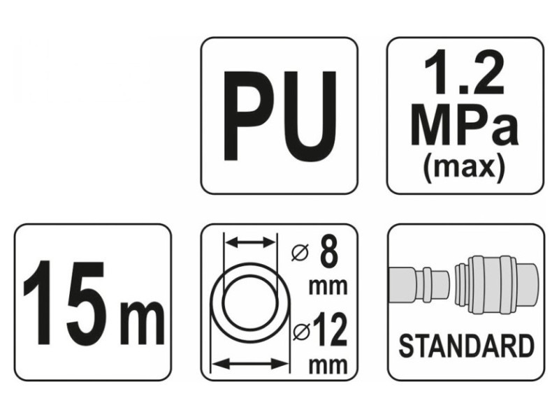 Professional spiral pneumatic hose terminated with quick disconnects. The 8,0x12 mm hose with a length of 15 meters is made of resistant polyurethane. The hose is resistant to low and high temperatures, so it can also be used outside the workshop. The fine coil design saves space, and the factory-installed quick couplings make it an indispensable tool in any workshop or manufacturing plant.