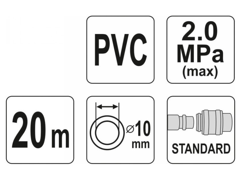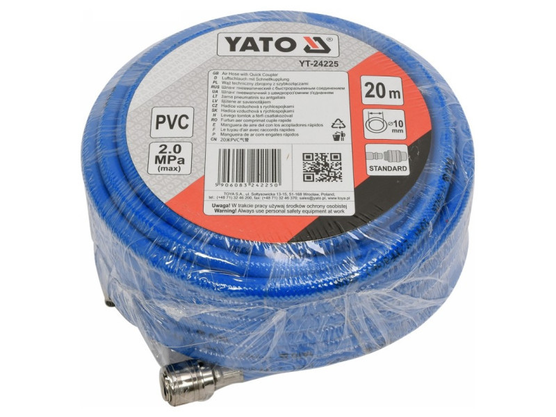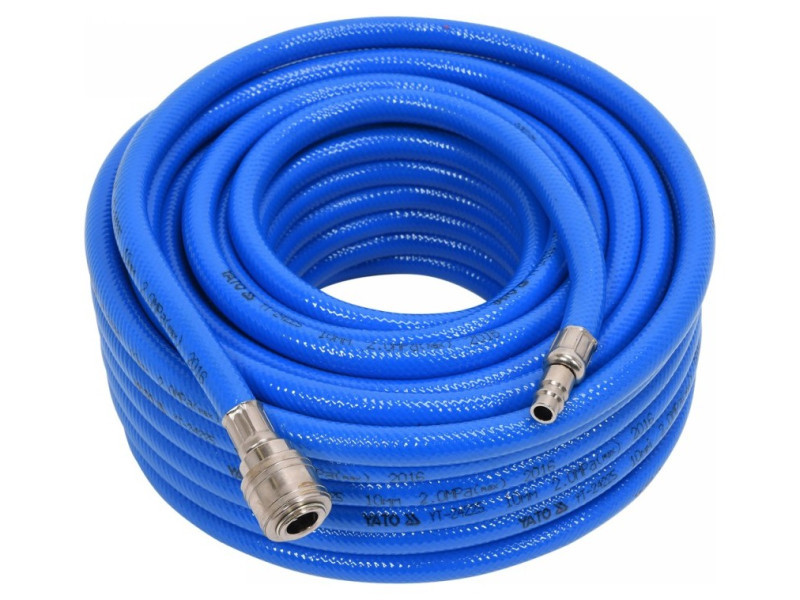 Professional reinforced air hose with crimped quick couplings. The hose has an inner diameter of 10 mm, with a length of 20 meters made of reinforced PVC. The hose is resistant to low and high temperatures, so it can also be used outside the workshop. It is an indispensable tool in any workshop or manufacturing plant.
