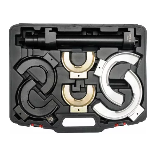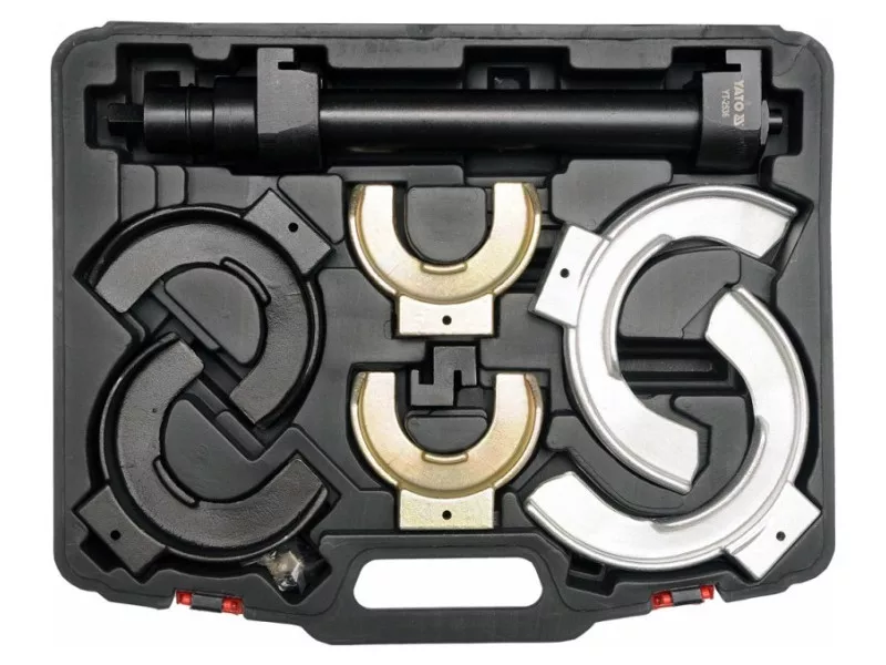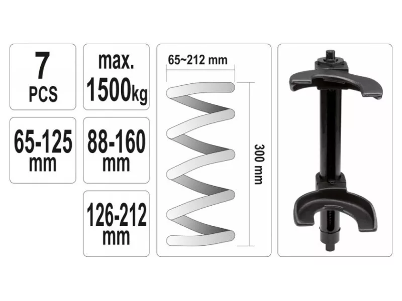 Professional McPherson springs with replaceable handles. 7-element set. The set is intended for replacing McPherson suspended shock absorbers. The welt has replaceable handles that allow springs operating with a diameter of 65 mm to 212 mm. Material: CRMO SCM415 alloy steel, phosphate surface. A single -column puller with a diameter of a 45 mm pipe. Drive: 21 mm screw with a small, trapezoidal thread. Three -point, adjustable handles adapted to the curvature of the spring. Adjustment in the range: 65 mm - 125 mm, 88 mm - 160 mm, 126 mm - 212 mm. Total length 400 mm (spring height 300 mm). Maximum pressure of the welt: 1500 kg.