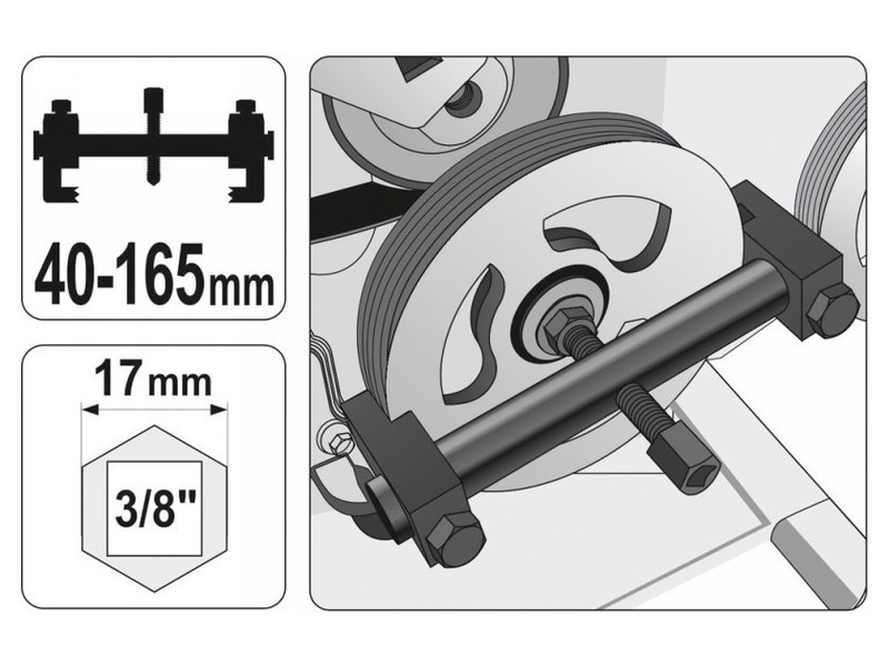 Professional puller for multi -lines, multi -line and alternators, air conditioning aggregates, water pumps, crankshaft, etc. The range of supported diameters up to 165 mm. It has precise cuts on the shoulders - blocked with special screws. • Small dimensions allow work in hard to reach places • Crides on the paws of the welt correspond to the grooves on the circle, which prevents damage • A puller made of hardened, hardened steel • work range 40 mm - 165 mm • Pressed paws pressed and blocked with knobs • IMBUS included in the set for blocking arms automotive workshops, industry - welt - Allen key