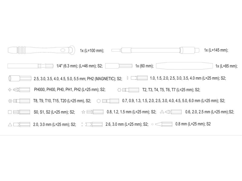 | Tip | flat, Phillips (PH), Torx, Torx TR, five-point Torx, hexagonal, square, Y-type, triangular, Spanner, punch |